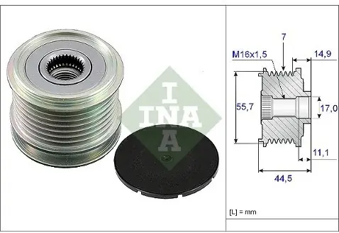 Liczba rowków: 7 Rozstaw od pierwszego rowka [mm]: 14,9 Szerokość [mm]: 44,5 Średnica 1/Średnica 2 [mm]: 55,7/17,0 dla numeru producenta: F-232001.