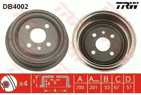 średnica bębna hamulcowego: 200,0 Maksymalna wielkość poslizgu bębna [mm]: 201 Wewnętrza wysokość bębna hamulcowego [mm]: 53 Wys. całk. bębna ham. [mm]: 67 Ilość otworów: 4 śr. zewn. bębna ham.